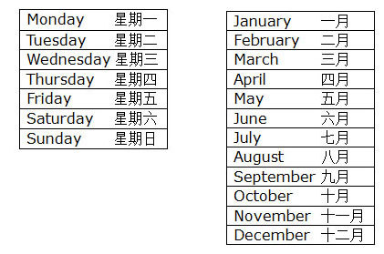 Monday(星期一)、Tuesday(星期二)、Wednesday(星期三)、Thursday(星期四)、Friday(星期五)、Saturday(星期六)、Sunday(星期天)